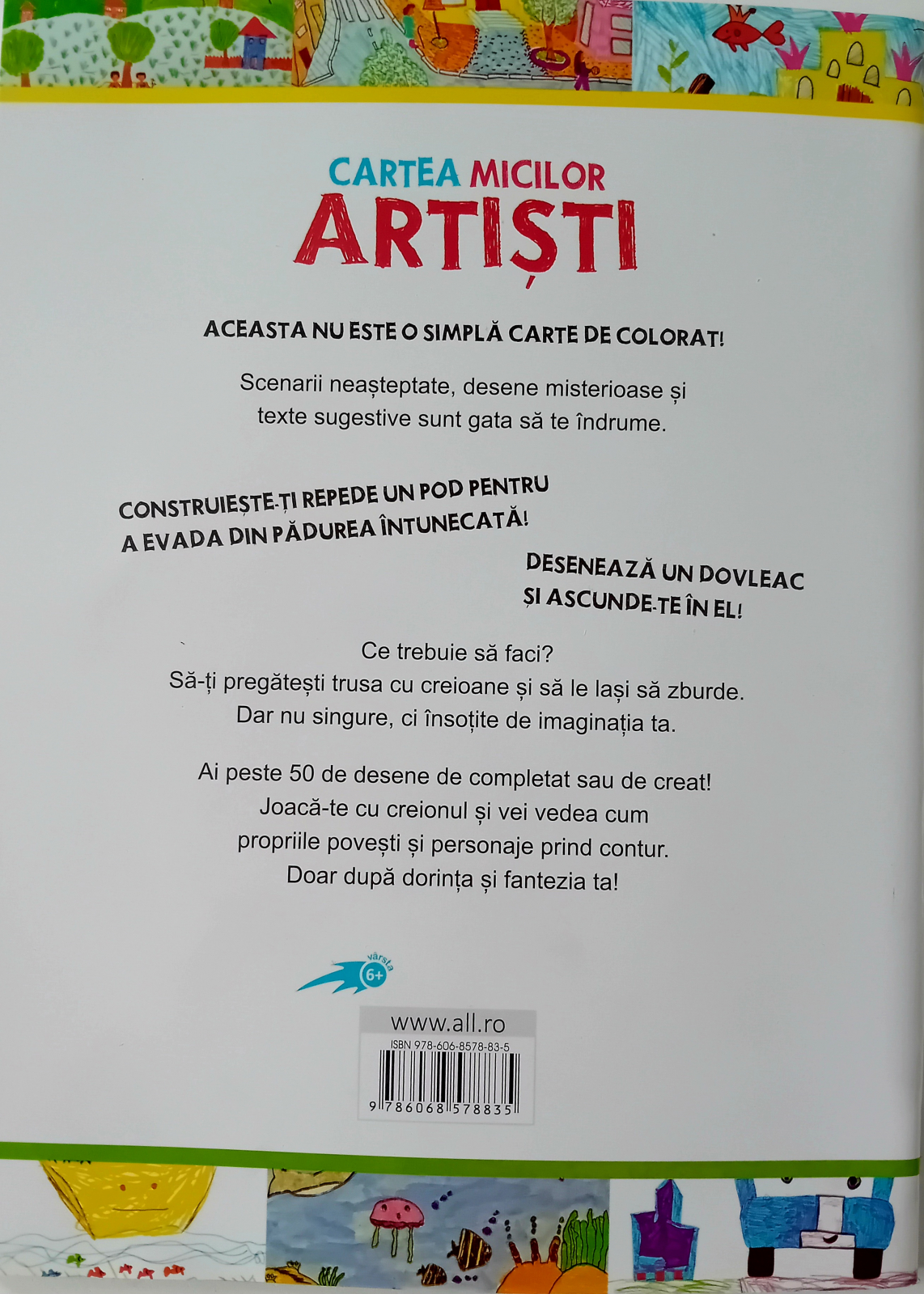 Această carte nu se limitează doar la desen și pictură, ci stimulează și gândirea creativă, încurajându-i pe copii să-și spună poveștile prin imagini. Este un instrument excelent pentru a petrece timp de calitate, departe de ecrane, și pentru a cultiva o pasiune pentru artă. Prin ilustrațiile sale pline de culoare și îndemnurile "Lasă-ți imaginația să zburde!", cartea devine un partener de încredere pentru fiecare mic artist.